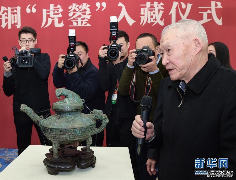 12月11日,中国国家博物馆研究院名誉院长孙机(前)在现场讲解青铜“虎鎣”相关知识。 新华社记者 李贺 摄