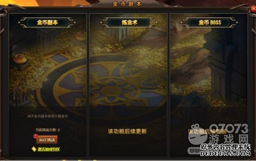 金币副本是游戏内获得金币的主要途径之一,金币副本下分金币副本、炼金术、金币BOSS三个不同的玩法(炼金术和金币BOSS暂未开放)