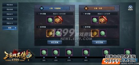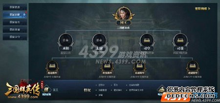 在《4399三国群英传》中,玩家自创建角色起,就加入了蜀国、魏国和吴国的其中一方阵营。国家系统由国家等级、官职、国家任务、国库资源以及国战等元素所组成。国家系统是养成玩家归属感的一个核心系统。每天会定期举行国战,完成国战任务后国家经验会有所提升。