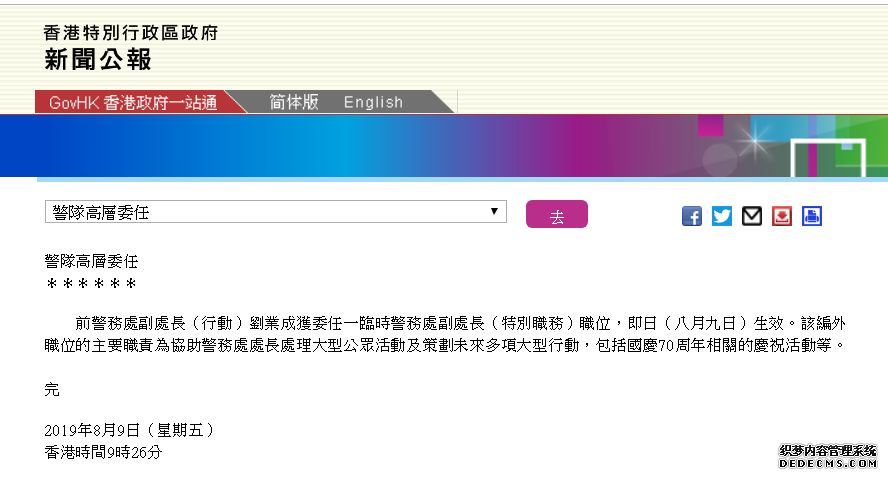 前警务处副处长(行动)刘业成获委任一临时警务处副处长(特别职务)职位,即日(八月九日)生效。该编外职位的主要职责为协助警务处处长处理大型公众活动及策划未来多项大型行动,包括国庆70周年相关的庆祝活动等。