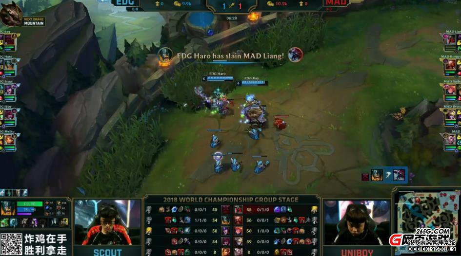 在选手个人实力上,EDG是比MAD强很多的,对位补刀上EDG的选手就领先MAD很多。16分钟,EDG双人组换到了上路,在草丛里阴到了落单的EZ直接击杀,EZ还是图样图森破啊~