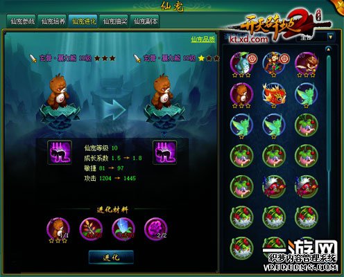 仙宠拥有着巨大的潜能,这种深藏的力量将随着仙友们的不懈培养而日渐展露足以耀世的光彩。仙宠有品质之分,由低到高分别为绿、蓝、紫、橙、紫金、至尊等不同品质,品质越高的仙宠,其技能、属性等效果越好。而对于仙宠的品质,众仙友们并非无可作为,仙友可通过对仙宠培养、进化等提升品质,挖掘仙宠最大的力量。